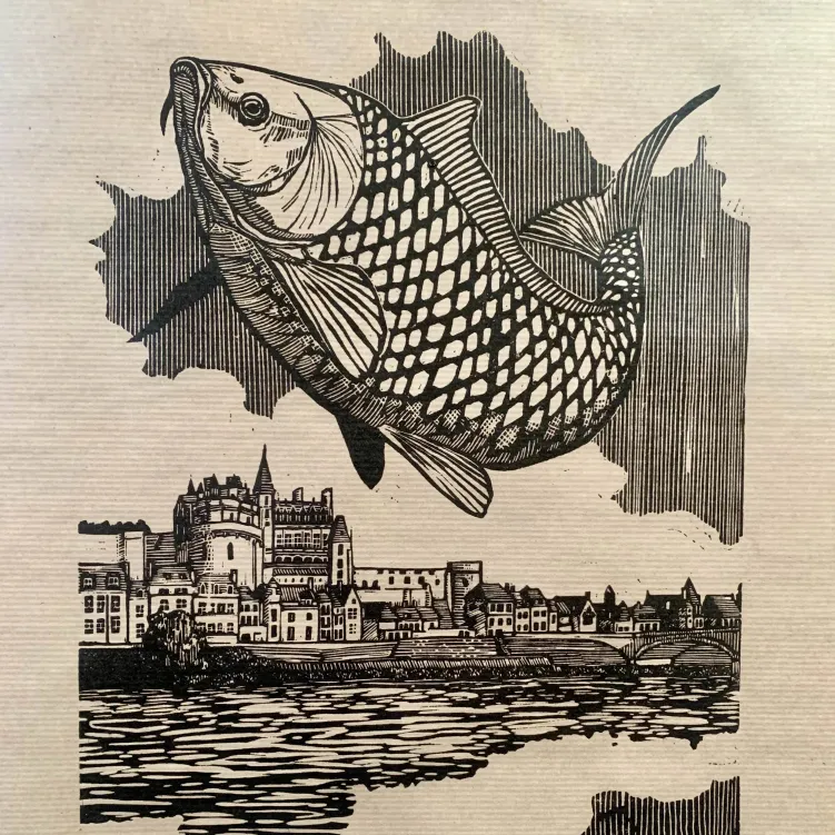 Estampe en linogravure, encre typographique noire sur papier kraft marron clair